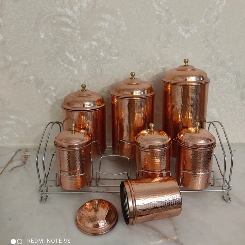جا ادویه مسی 7 تایی همراه استند سایز بزرگ ارتفاع 20 دهانه 10 سایز کوچک ارتفاع 10.5 دهانه 5.5