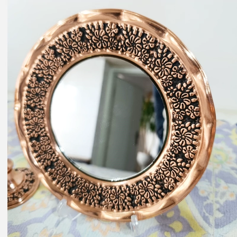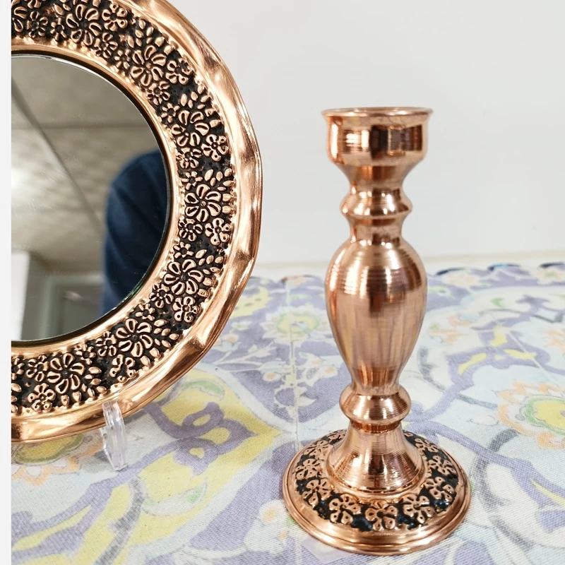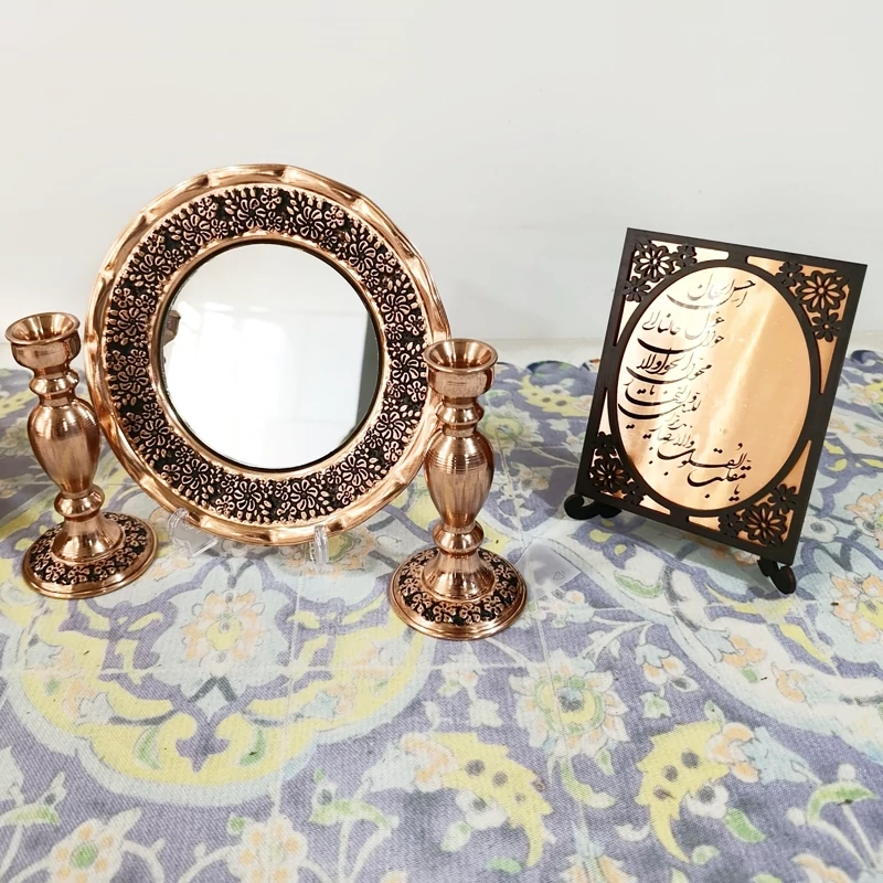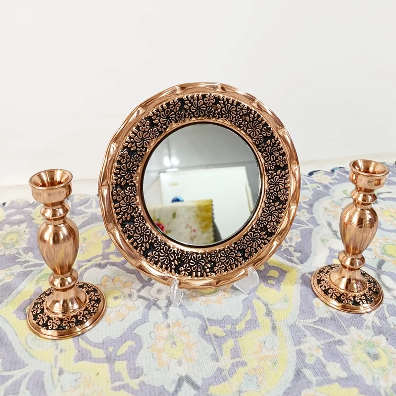 دور تا دور قاب آیینه و پایه شمعدانها با گلهای برجسته دستکار تزئین شده و با پرداخت ظریف، زیبایی چشمنوازی ایجاد کرده است. استفاده از پوشش رنگ ثابت (نانو) باعث شده این محصول در برابر تغییر رنگ مقاوم باشد و سالها بدرخشد.