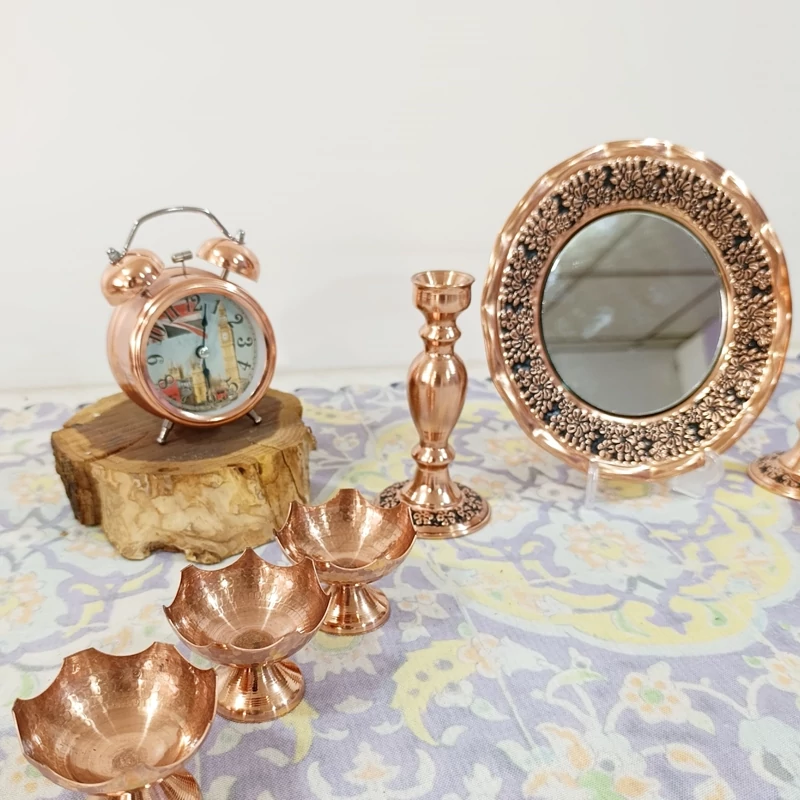 ست هفتسین مسی هماهنگ با این آیینه و شمعدان نیز در غرفه موجود است.