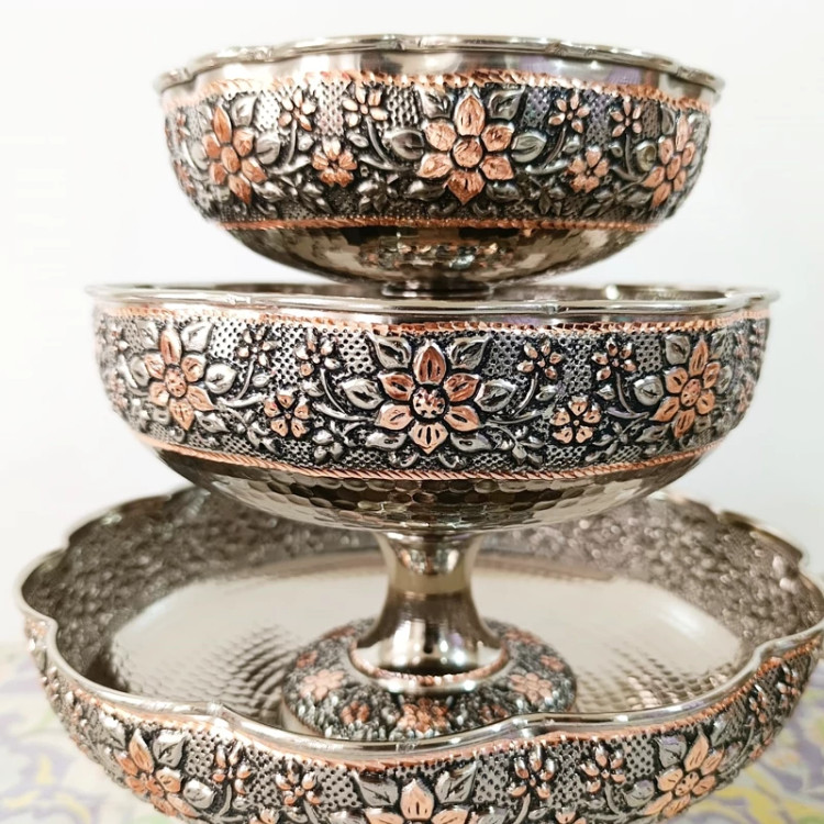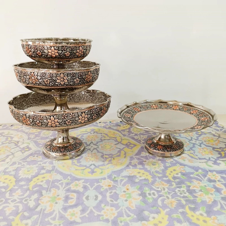 سرویس پذیرایی 4 تیکه مسی کروم تراش شده نانوطرح گل برجسته قلم کاری