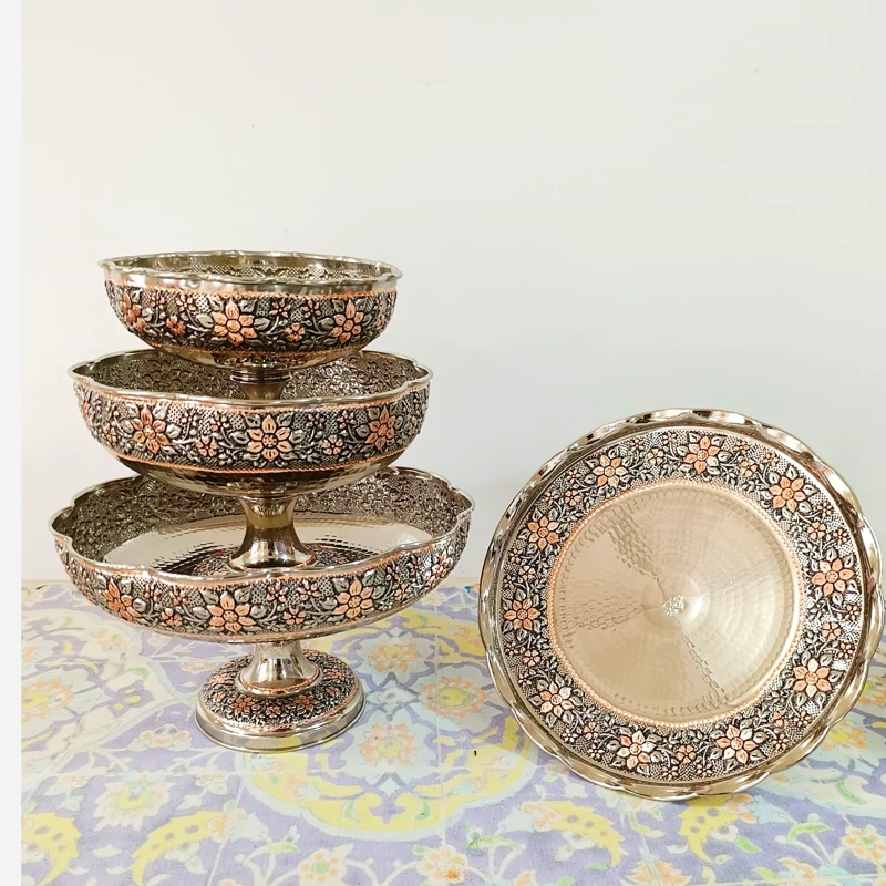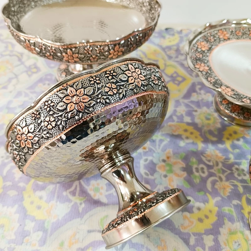 سرویس پذیرایی 4 تیکه مسی کروم تراش شده نانوطرح گل برجسته قلم کاری