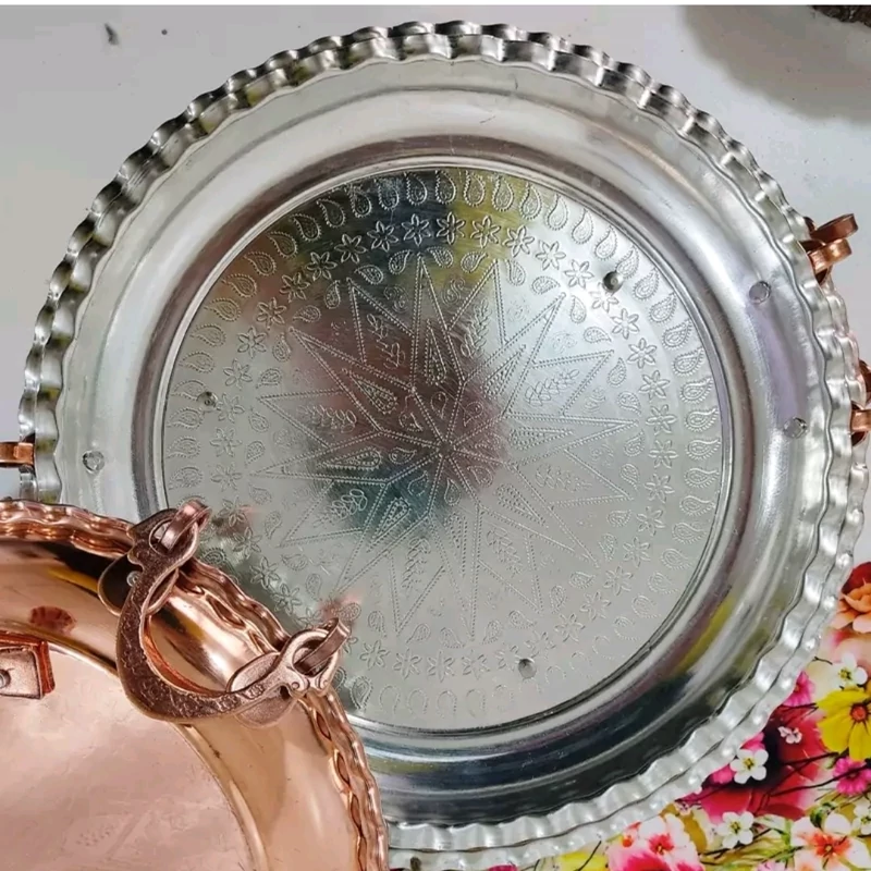 مجمع سینی سه عددی در سه سایز پایه دار و دسته دار داخل قلع بیرون نانو شده مناسب پلو سالاد مرغ شیرینی کیک و هر چیز دیگر با طرح برجسته زیبا