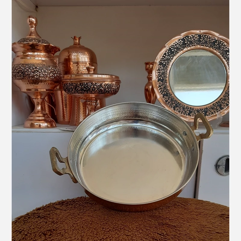 ماهیتابه مسی چکشی یکی از ظروف سنتی و پرکاربرد آشپزی ایرانی است که از مس خالص ساخته شده و سطح آن با روش چکشکاری دستی فرم داده و تقویت میشود. این نوع ساخت باعث میشود ظرف هم زیباتر باشد و هم مقاومت بیشتری در برابر ضربه و حرارت پیدا کند.