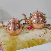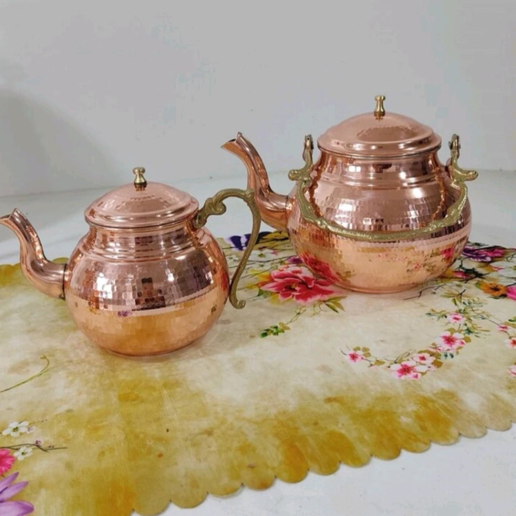 کتری مسی و قوری مس دسته برنجی کتری ۲ لیتری داخل قلع ارتفاع کتری ۱۷ سانت ارتفاع قوری ۱۳ سانت در مس زنجان نمونه