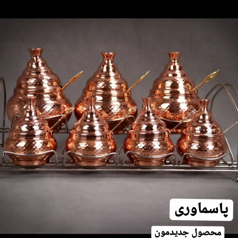 جا ادویه مسی 7 تایی همراه استند سایز بزرگ ارتفاع 20 دهانه 10 سایز کوچک ارتفاع 10.5 دهانه 5.5