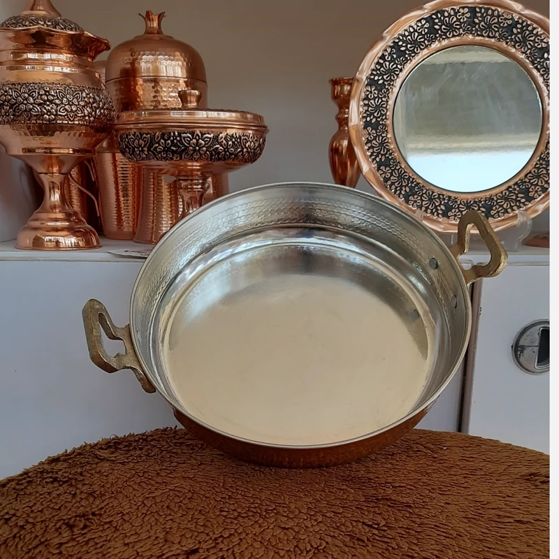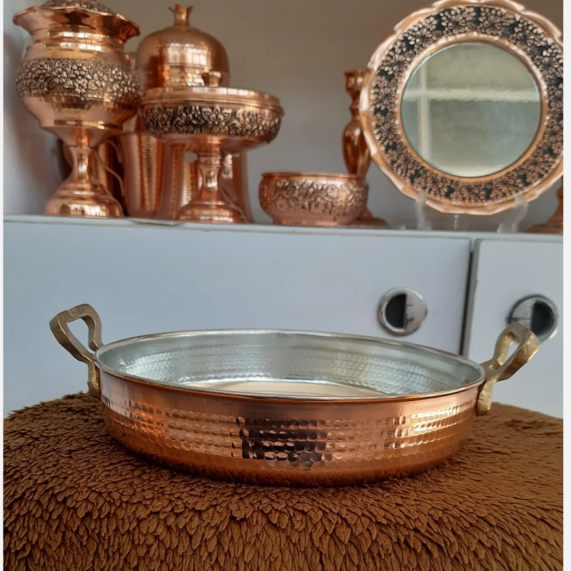 ماهیتابه مسی چکشی یکی از ظروف سنتی و پرکاربرد آشپزی ایرانی است که از مس خالص ساخته شده و سطح آن با روش چکشکاری دستی فرم داده و تقویت میشود. این نوع ساخت باعث میشود ظرف هم زیباتر باشد و هم مقاومت بیشتری در برابر ضربه و حرارت پیدا کند.