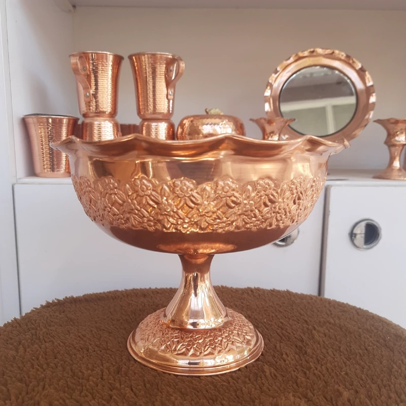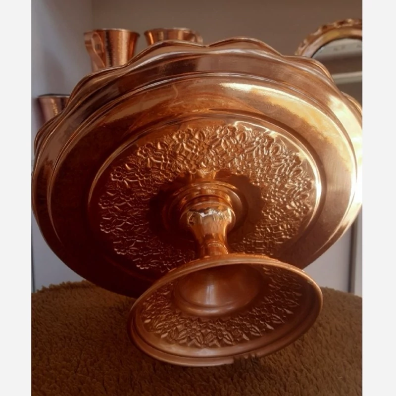 سرویس پذیرایی مسی گل برجسته، ترکیبی از ظرافت هنر دست ایرانی و درخشش چشمنواز فلز مس است. این مجموعه زیبا با طراحی گلهای برجسته و حکاکیهای هنرمندانه، جلوهای باشکوه و سنتی به میز پذیرایی شما میبخشد.