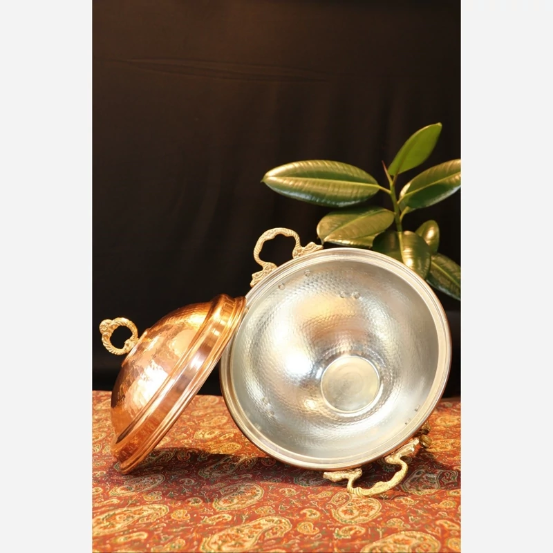 این ظرف بسیار زیبا و کاربردی با بهترین مواد اولیه مس تولید شده محصول نانو شده است و رنگ ثابت دارد.،قابلیت شستشو دارد و قسمت داخلی محصول سفید قلع شده هست.چکش کاری شده ،از این سوفله خوری می توانید برای آش،سوپ،سالاد و مرغ استفاده کنید