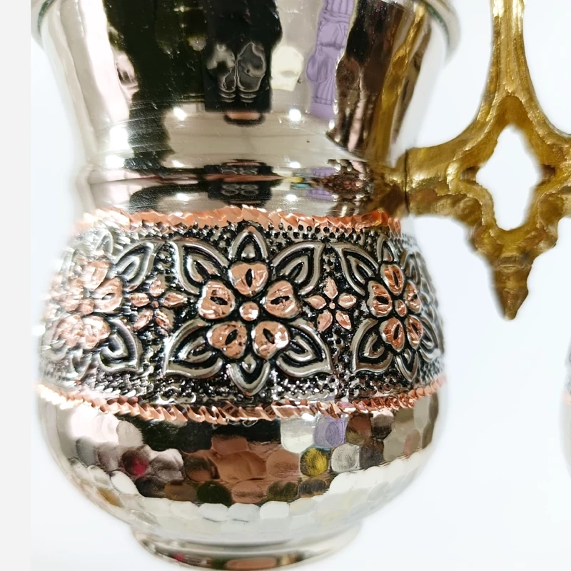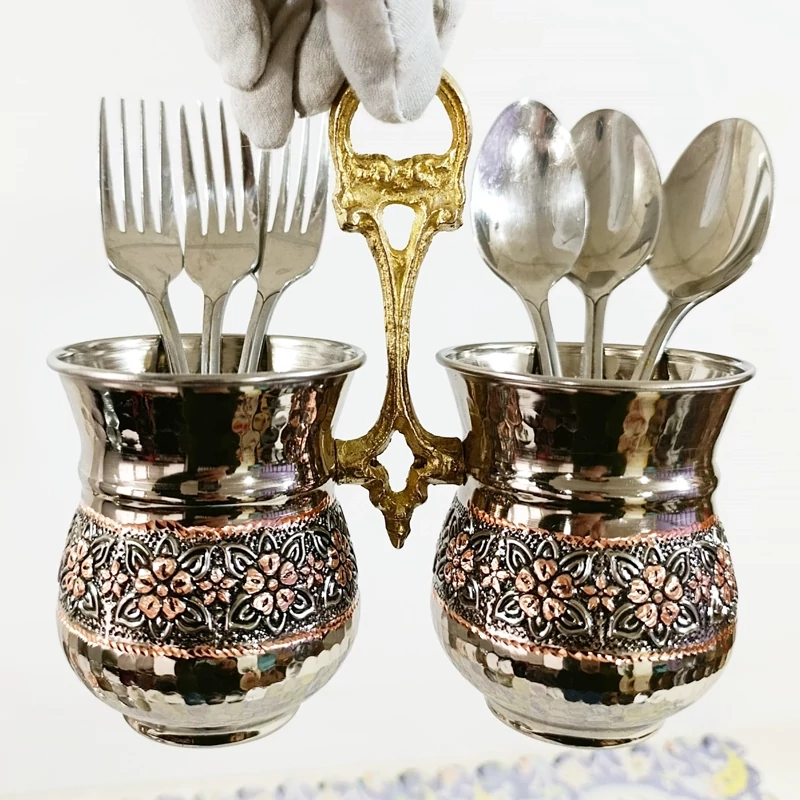 بدنه این جاقاشقی از مس خالص ساخته شده و روی آن گلهای برجسته با هنر سیاهقلمکاری سنتی اجرا شده است. سپس کل کار آبکاری کروم با رنگ نقرهای ثابت شده و در مرحله نهایی، گلها با دست تراش خوردهاند تا ترکیب چشمنواز دو رنگ مسی و نقرهای بهصورت کاملاً طبیعی و هنری نمایان شود.