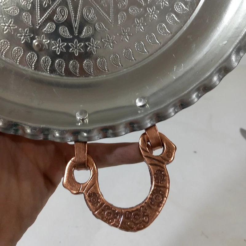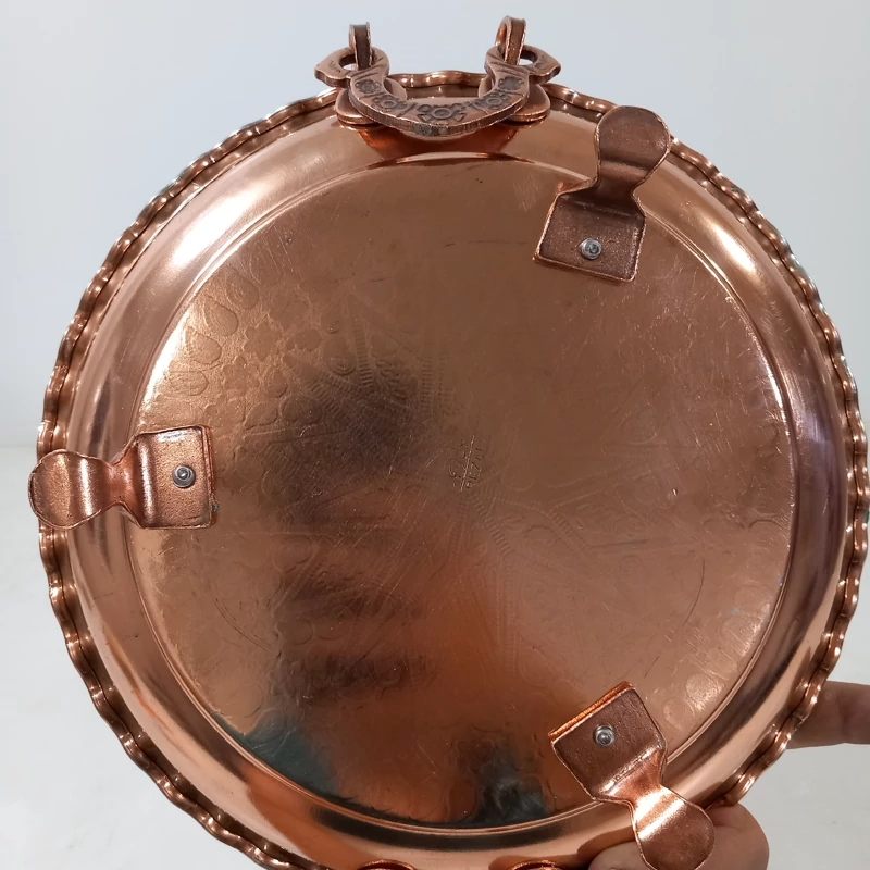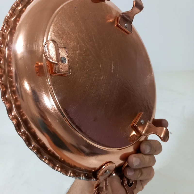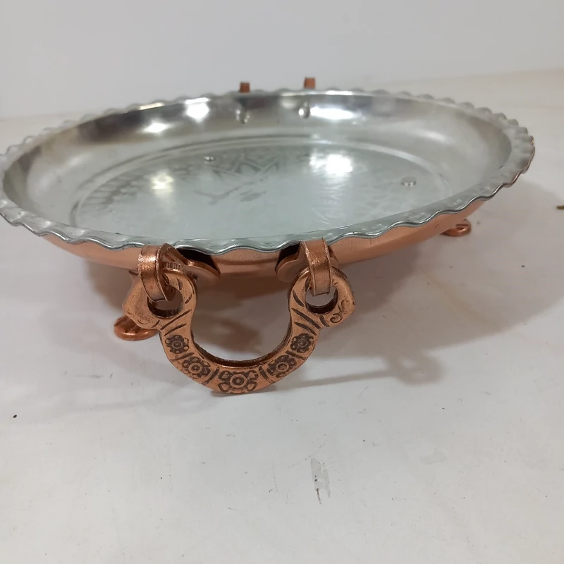 مجمع طرح دار مسی زنجان مناسب مرغ خوری و سالاد و شیرینی دسته پایه دار از جنس مس داخل قلع شده بیرون ظرف نانو شده و رنگ ثابت قطر ۲۷