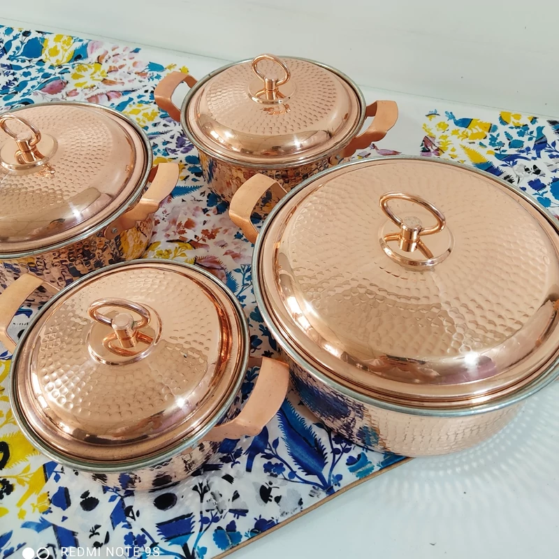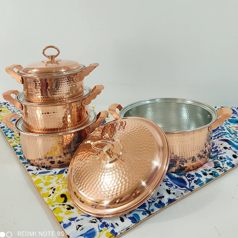 یک سرویس کامل قابلمه در 4 سایز مختلف همراه با یک ماهی تابه در دار قطر 22 دسته دار داخل قابلمه و ماهیتابه قلع کاری شده و همگی چکش کاری شده هستند قابلمه ها رنگ ثابت و نانو شده میباشند ورق بسیار ضخیم و شفاف