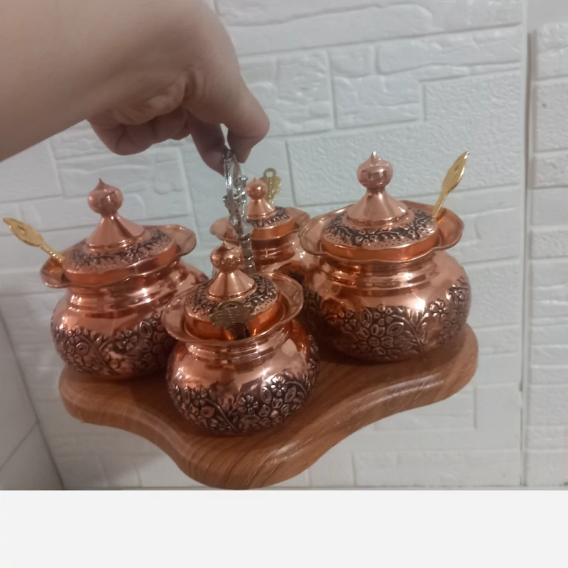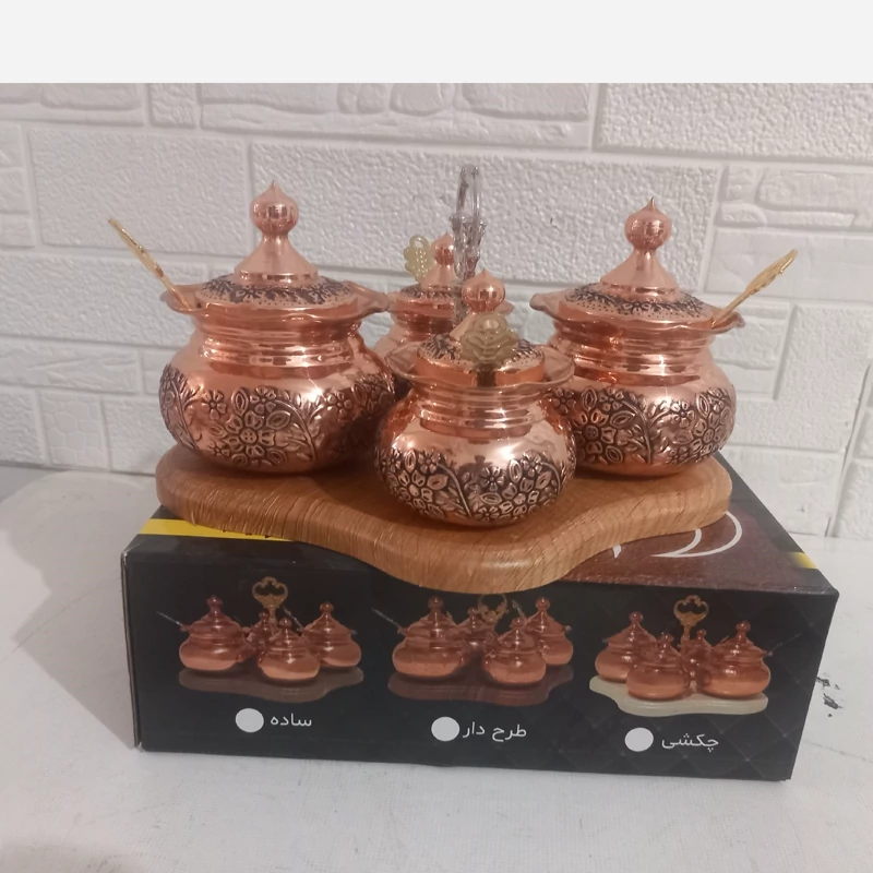 جا ادویه یا پاسماوری 4تایی مسی گلبرگ دوسایز بزرگ و دوسایز کوچک میباشد همراه استند چوبی و قاشق نانو شده رنگ ثابت ارسال رایگان ❌️❌️دوستان دسته وسط استند مطابق عکس ها ممکن هست طلایی یا نقره ای،و رنگ استند تیره یا روشن باشد.انتخابی نمیباشد.