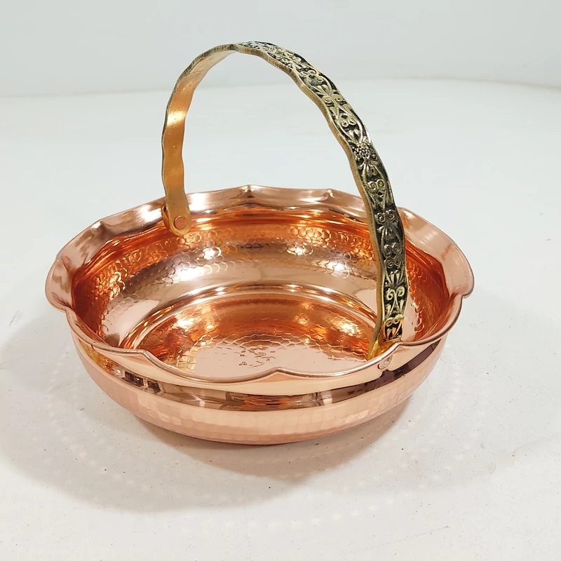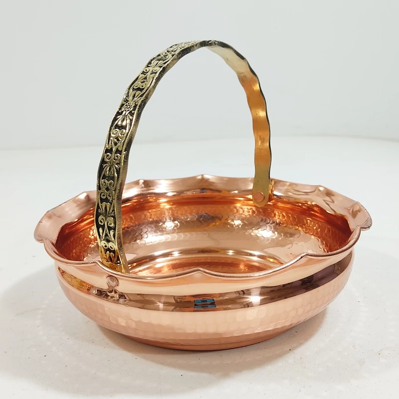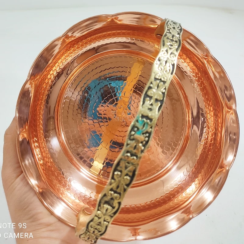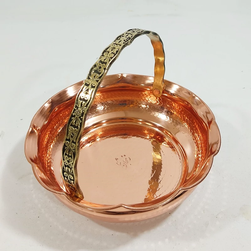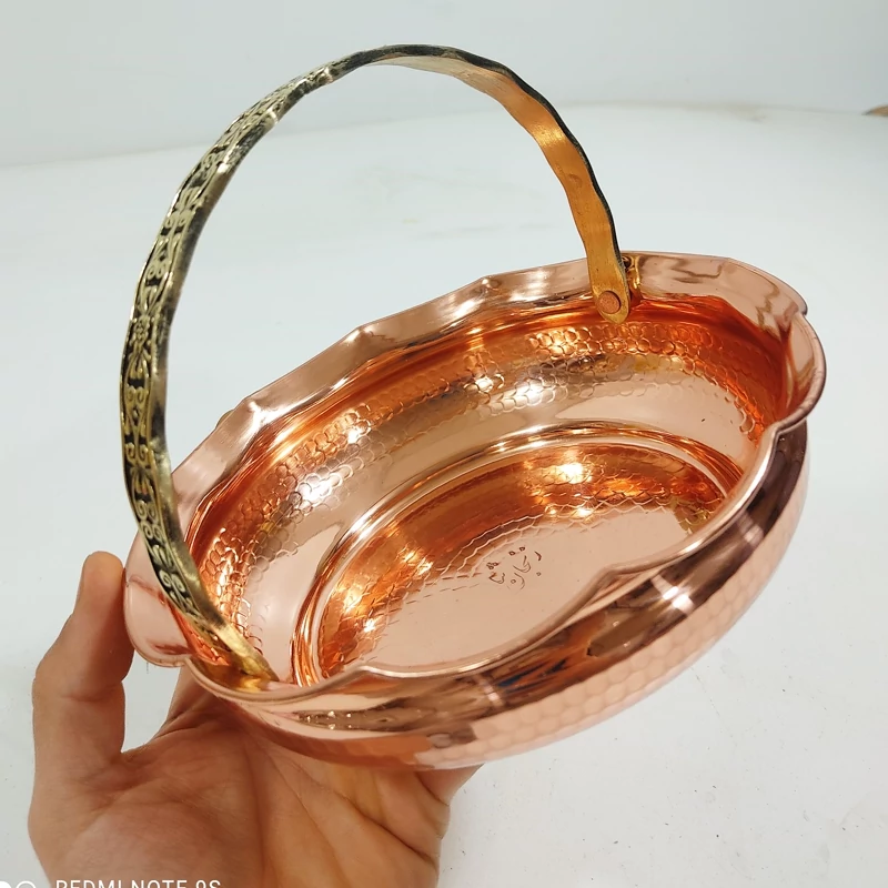 این سبد آجیلخوری مسی با طراحی چشمنواز و ساخت دستی، یکی از خاصترین انتخابها برای پذیرایی، هدیه یا دکور خانههای اصیل ایرانی است. بدنهی آن از مس ناب زنجان ساخته شده و با چکشکاری دقیق دستی شکل گرفته است.