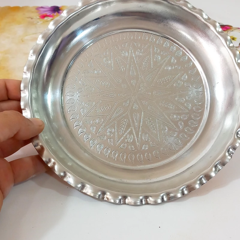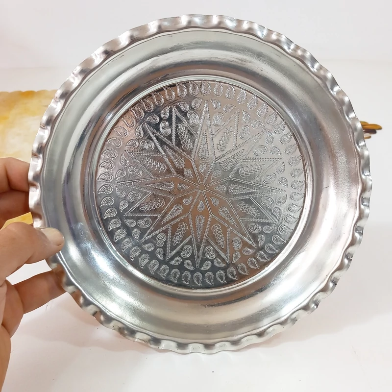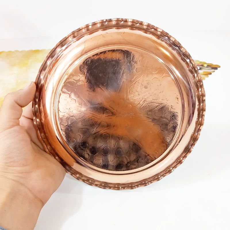 دیس پلو یا سالاد خوری تمام مس زنجان ضخیم و درجه یک قطر ۲۱ که سایز بندی کامل این محصول موجود است داخل ظرف طرح دار و قلع شده است