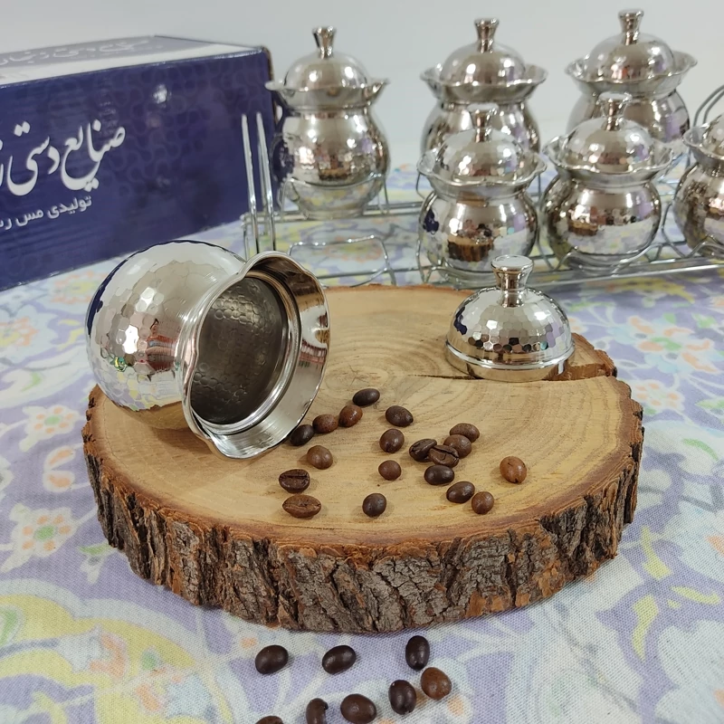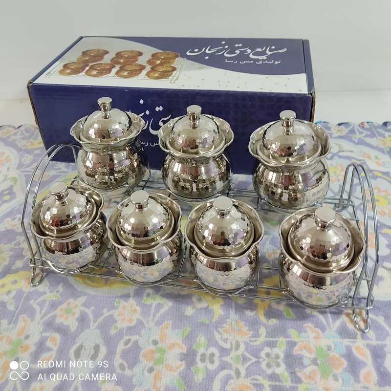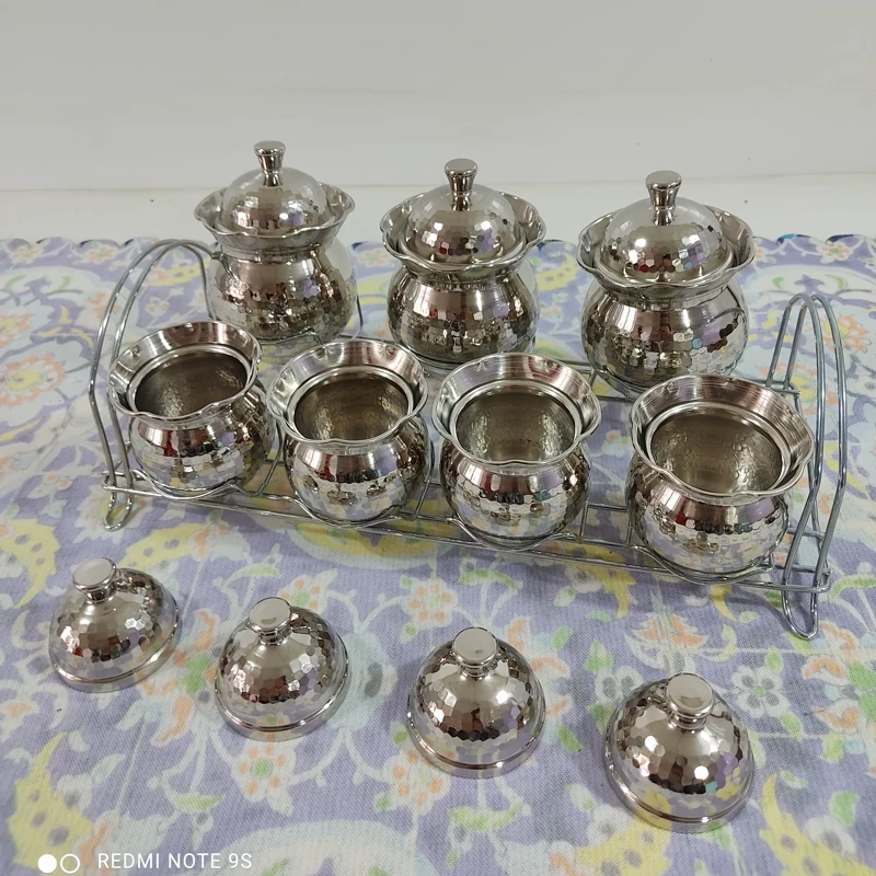 جنس ظروف: تماممسی، چکشکاریشده، آبکاریشده با کروم نقرهای براق (رنگ ثابت)