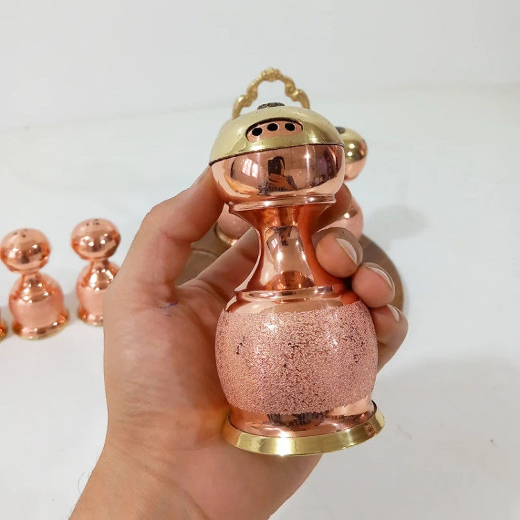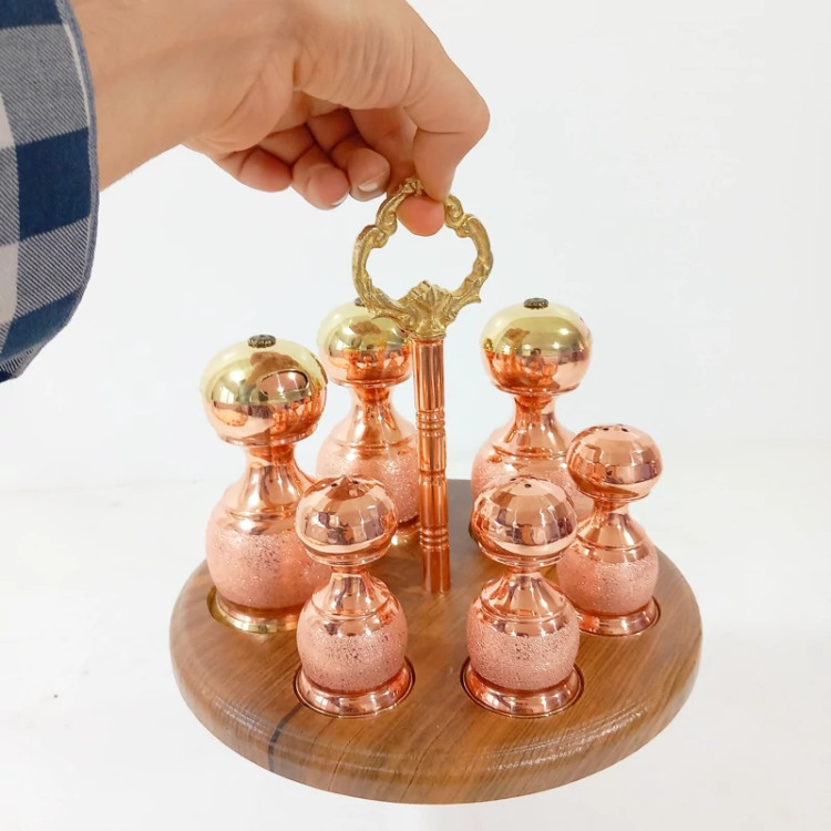سرویس پاسماوری جا ادویه و نمکدان مسی با استند چوبی