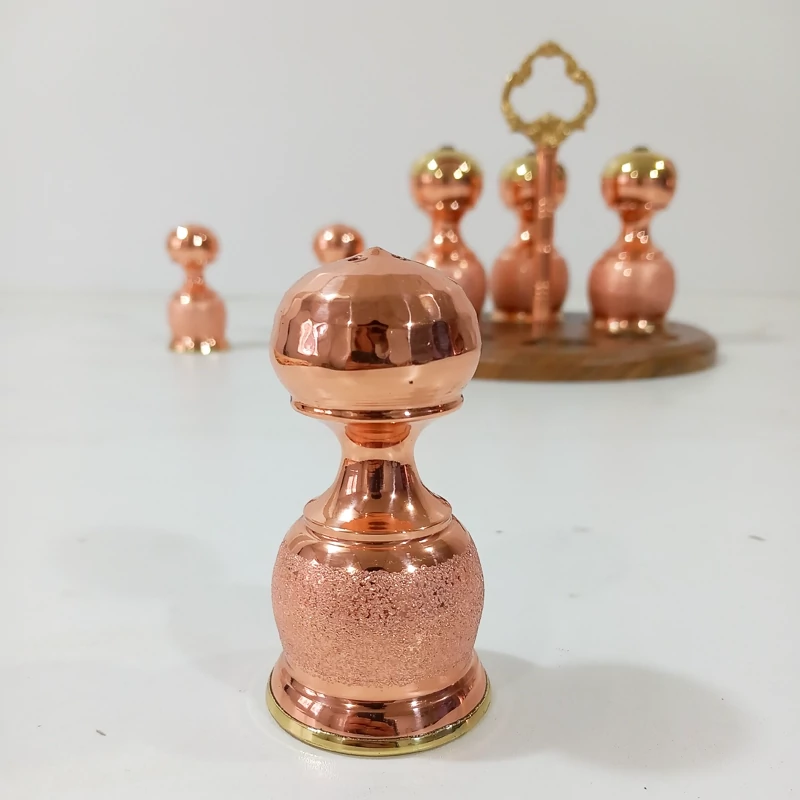 سرویس پاسماوری جا ادویه و نمکدان مسی با استند چوبی