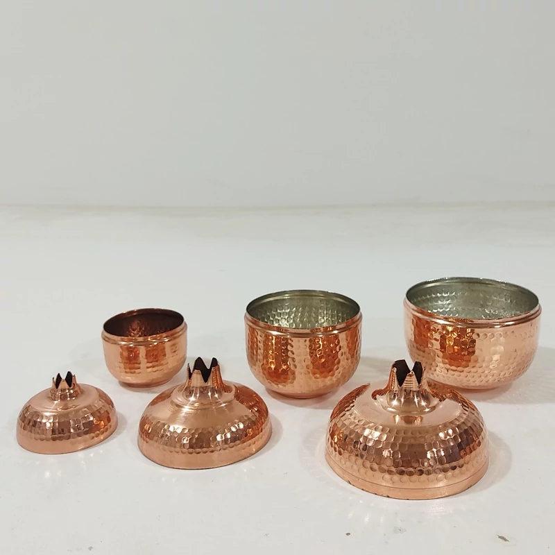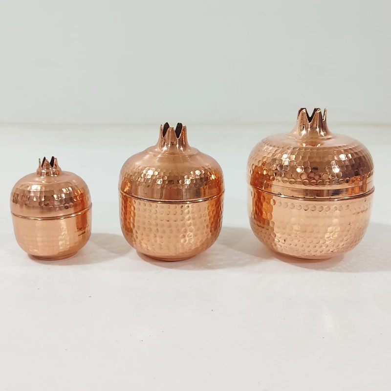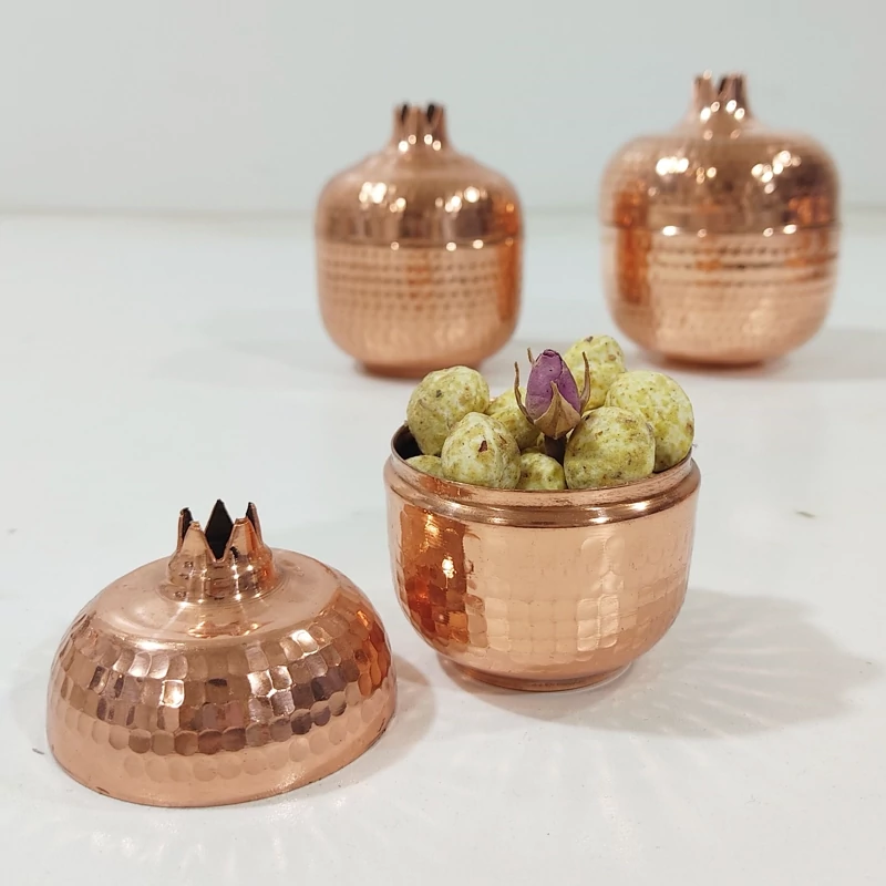 سه سایز قندان انار مسی دست ساز زنجاننانو شده و رنگ ثابت با قطر های ۵/۵ ۷/۵ ۹سانت داخل قلع کاری شده مناسب تنقلات و قندان برای شب یلدا و ...