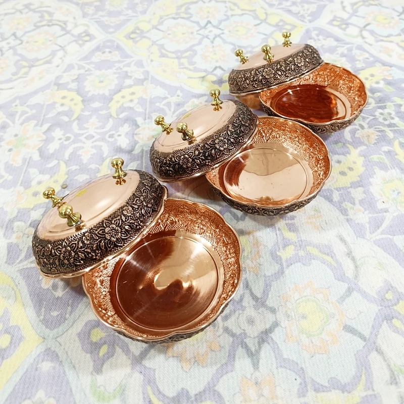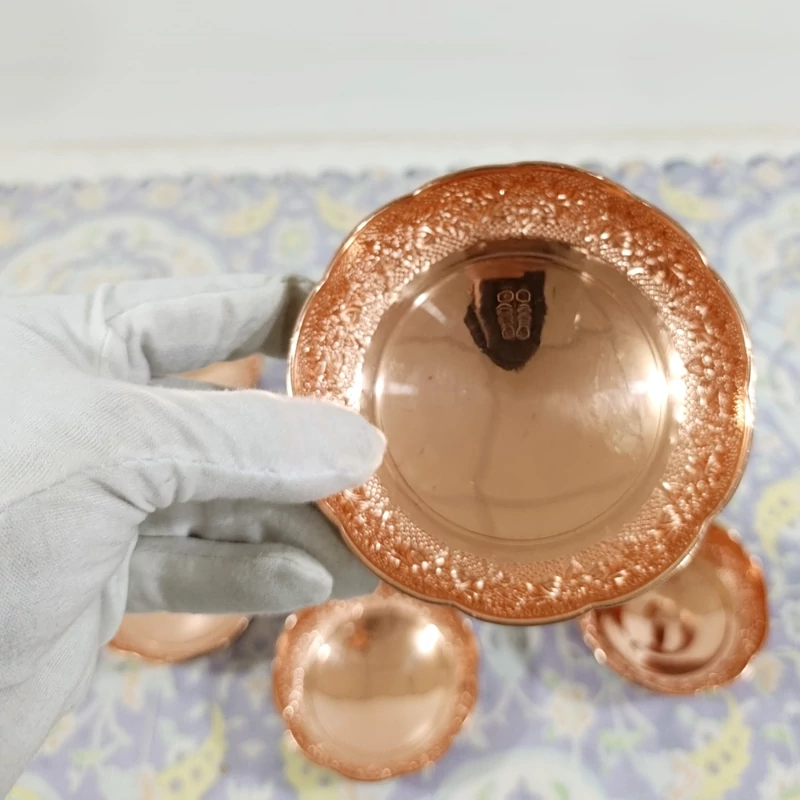 🟤 پیاله مسی سهپایه نانو شده (ست 6 عددی) گل برجسته سیاهقلم