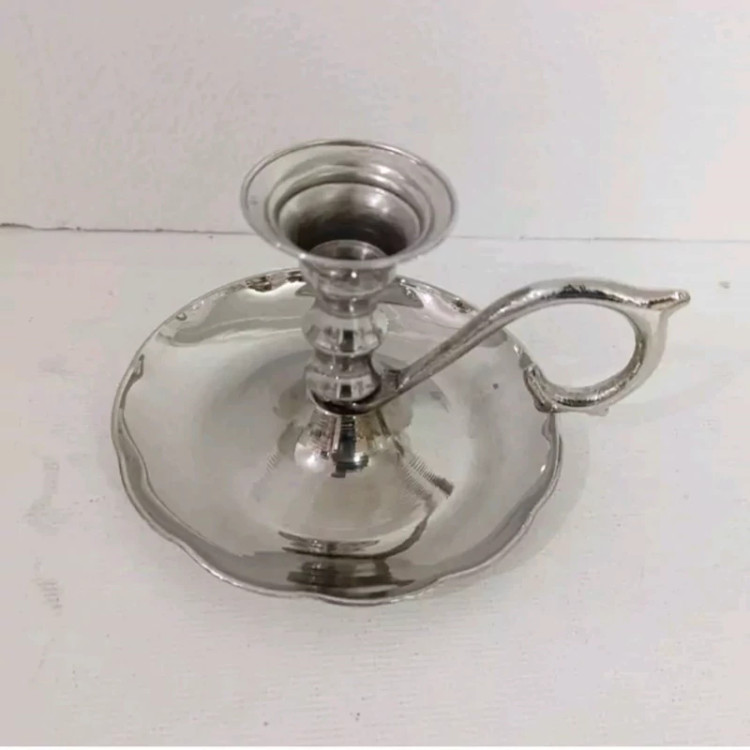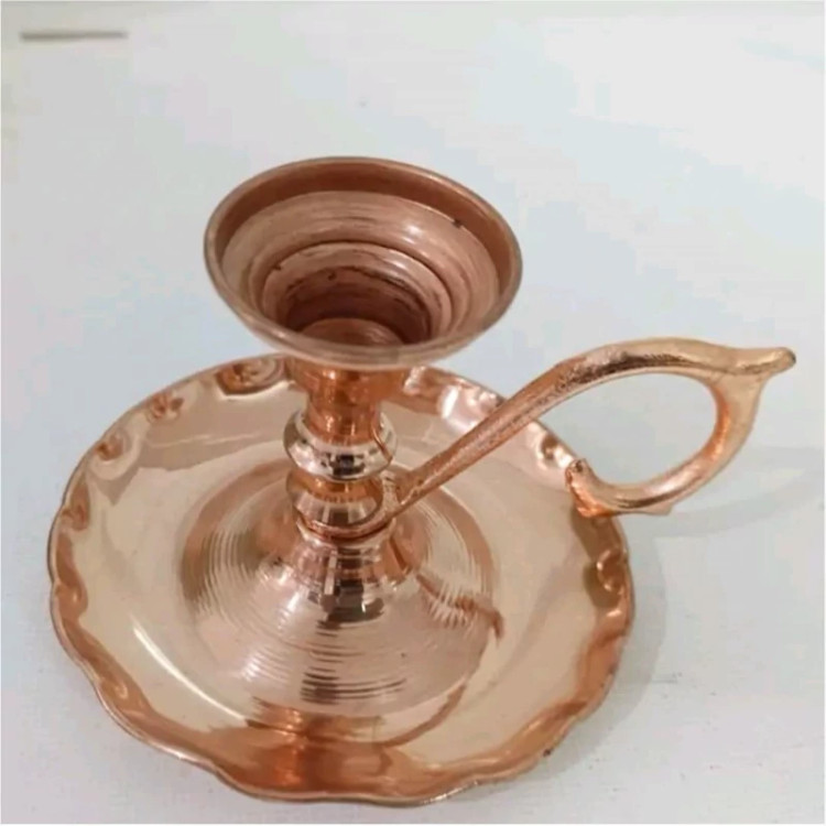 جا شمعی در دو رنگ مسی و کروم ارتفاع10 سانت وزن 190 گرم قطر بشقاب13 دسته برنجی